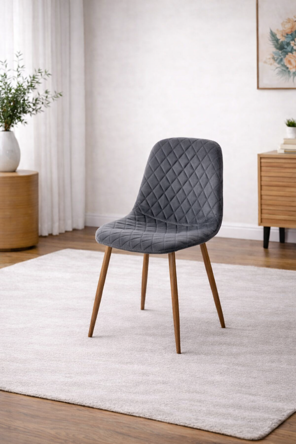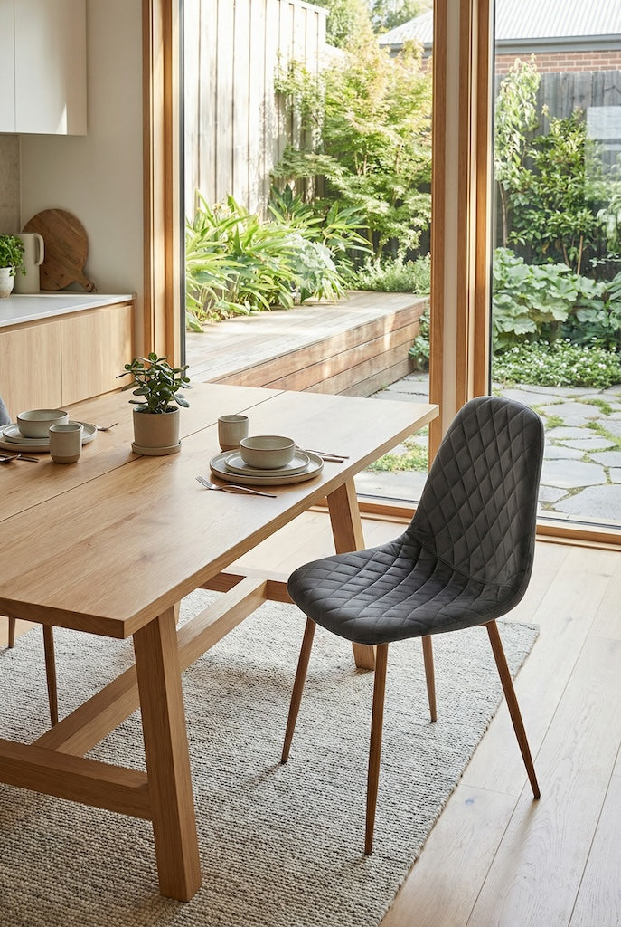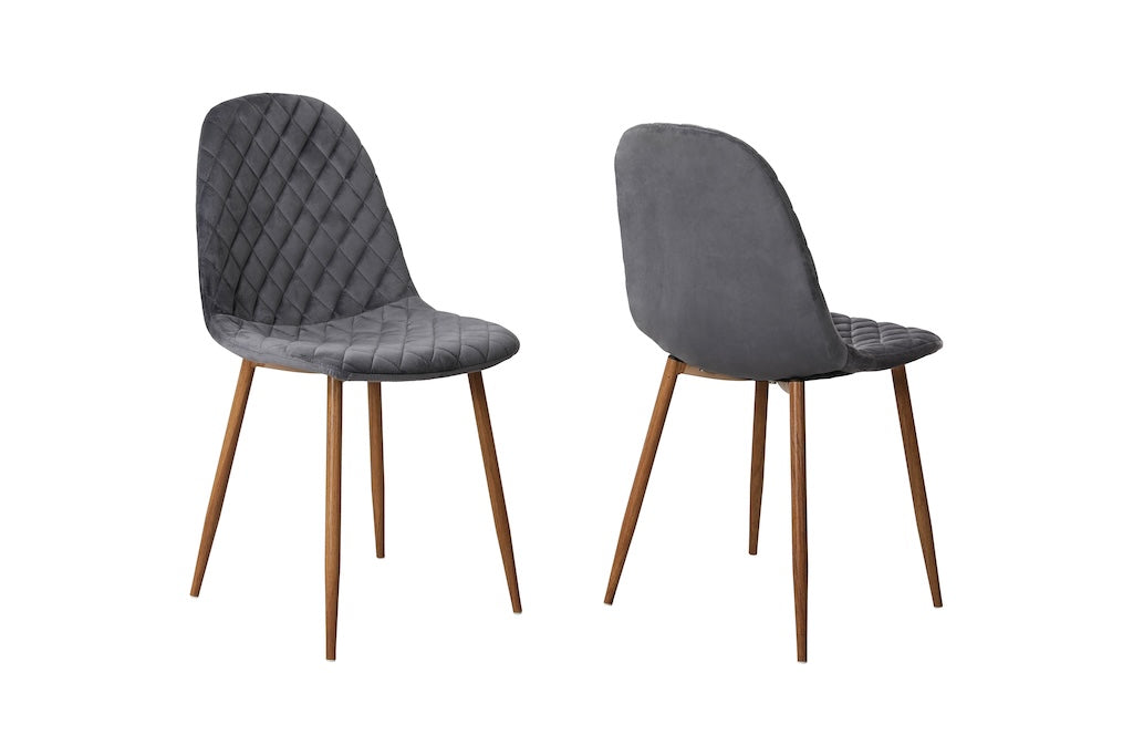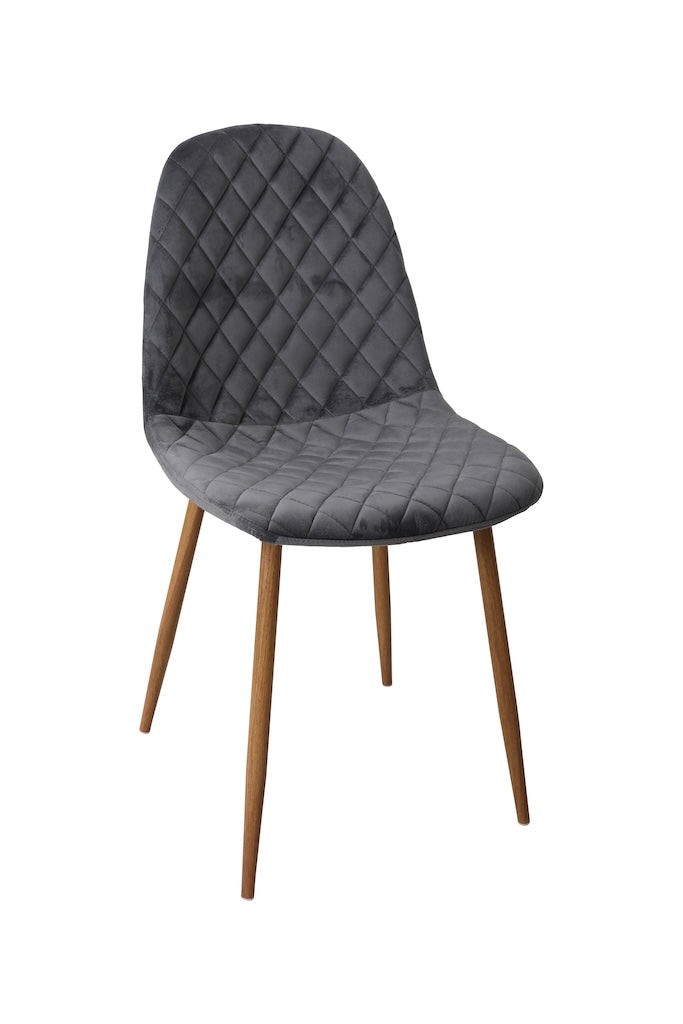 Krzesło Alder wyróżnia się tapicerką z wysokiej jakości tkaniny typu Dutch Velvet w odcieniu ciemnego popielu. Subtelny połysk materiału pięknie odbija światło, nadając wnętrzu elegancji i głębi. Dekoracyjne przeszycia w kształcie rombów podkreślają nowoczesny, a zarazem klasyczny charakter mebla, czyniąc go wyrazistym elementem jadalni lub salonu.