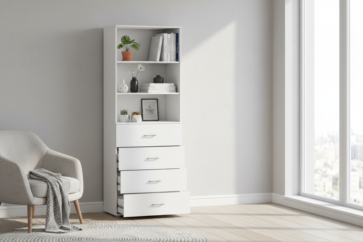 Górna część regału oferuje otwarte półki, idealne do eksponowania dekoracji, książek czy dokumentów, podczas gdy dolna komoda wyposażona jest w cztery pojemne szuflady. Szuflady te, osadzone na prowadnicach kulkowych z pełnym wysuwem, gwarantują płynne i komfortowe użytkowanie. Wysokość frontu każdej szuflady to imponujące 25,5 cm, co pozwala na przechowywanie większych przedmiotów. Wymiary użyteczne wewnętrzne szuflad to: głębokość 33 cm lub 43 cm, szerokość dostosowana do wybranej wersji regału (31/ 41/ 51/ 61/ 71 cm) oraz wysokość boczku 16 cm, umożliwiająca bezpieczne ułożenie przedmiotów do 21 cm wysokości.