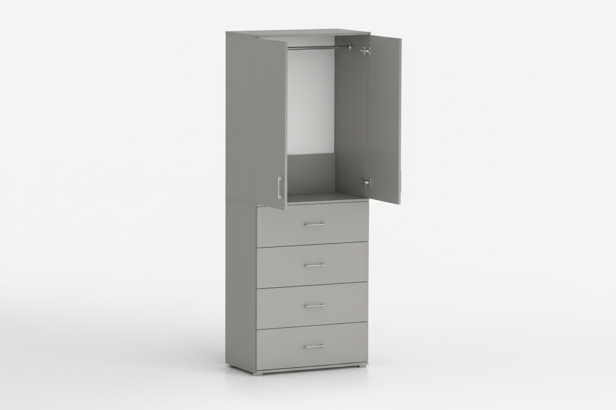Górna część szafy Pola 215 to idealne miejsce na Twoją garderobę wymagającą zawieszenia. Wyposażona w solidny drążek na ubrania, zapewnia optymalne warunki dla koszul, sukienek czy marynarek. Wysokość tej sekcji wynosi 104 cm, co umożliwia swobodne przechowywanie nawet dłuższych elementów odzieży. Poniżej umieszczono cztery pojemne szuflady, które doskonale sprawdzą się do organizacji bielizny, akcesoriów lub odzieży składanej. Dzięki zastosowaniu prowadnic kulkowych z pełnym wysuwem, każda szuflada otwiera się płynnie i cicho, oferując łatwy dostęp do całej zawartości.