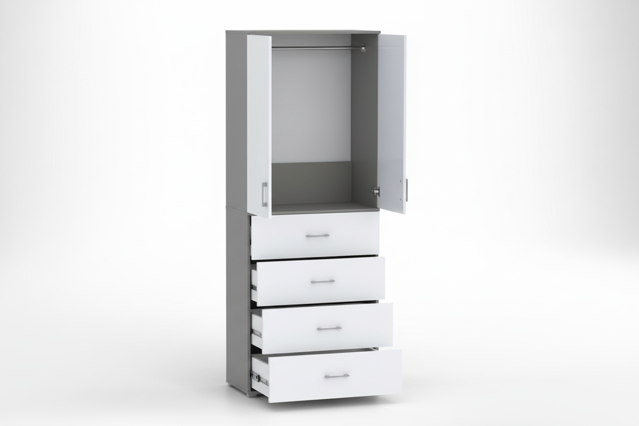 Górna część szafy to przestronna komora wyposażona w solidny drążek na ubrania. Wysokość tej części wynosi 104 cm, co zapewnia komfortowe zawieszenie koszul, sukienek czy marynarek, chroniąc je przed zagnieceniami. Poniżej znajdują się cztery pojemne szuflady, które stanowią idealne miejsce na bieliznę, akcesoria, czy odzież złożoną.