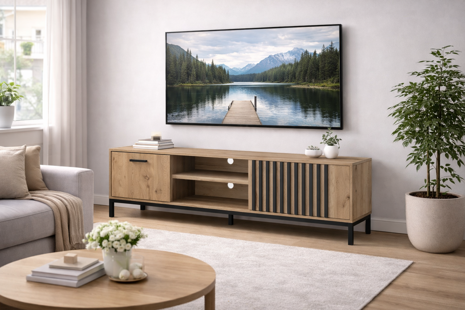 Szukasz szafki RTV, która połączy nowoczesny styl z wyrazistą strukturą drewna i zapewni praktyczne rozwiązania w strefie telewizyjnej? Szafka RTV Krates to propozycja łącząca minimalistyczną estetykę z mocnym, dekoracyjnym akcentem, który podkreśla aranżację salonu lub pokoju dziennego. Jej harmonijna forma i starannie dobrane materiały sprawiają, że wnętrze zyskuje zarówno funkcjonalność, jak i wyrazisty styl.