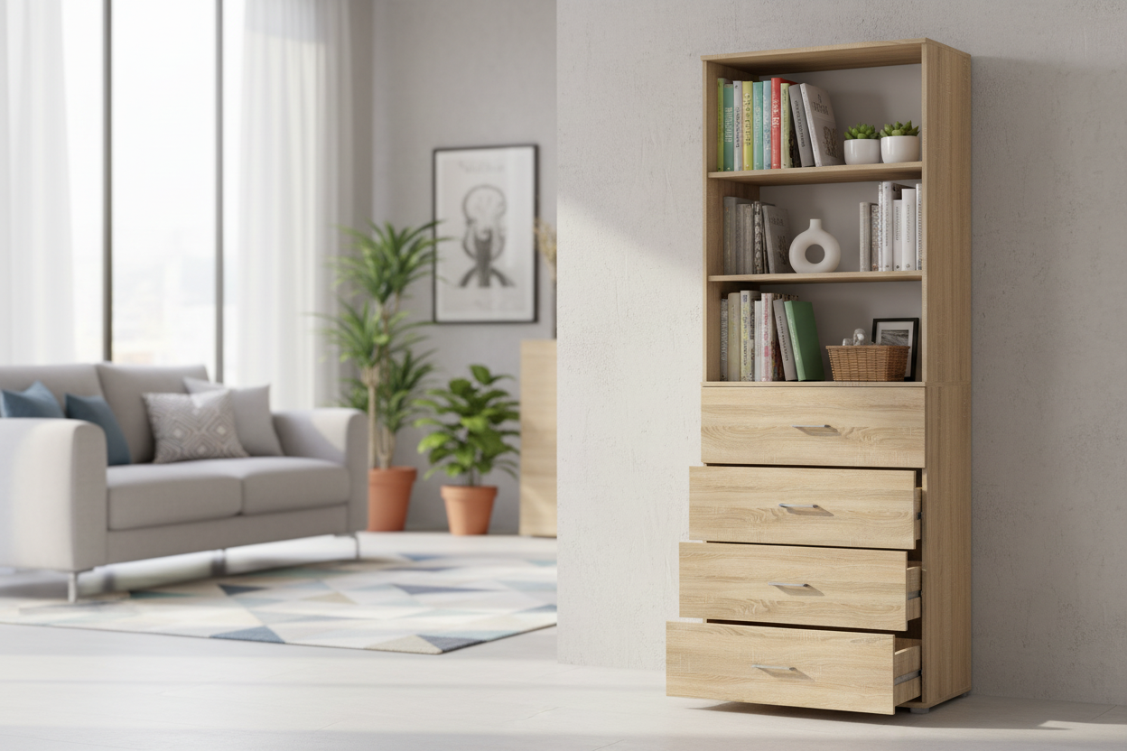 Dolna sekcja regału wyposażona jest w cztery pojemne szuflady, które stanowią doskonałe miejsce do przechowywania rzeczy, które chcemy ukryć przed wzrokiem, zachowując porządek. Szuflady te zamontowano na wysokiej jakości prowadnicach kulkowych z pełnym wysuwem, co zapewnia płynne i komfortowe otwieranie oraz pełny dostęp do zawartości bez blokowania. Wysokość frontu każdej szuflady wynosi aż 25,5 cm.