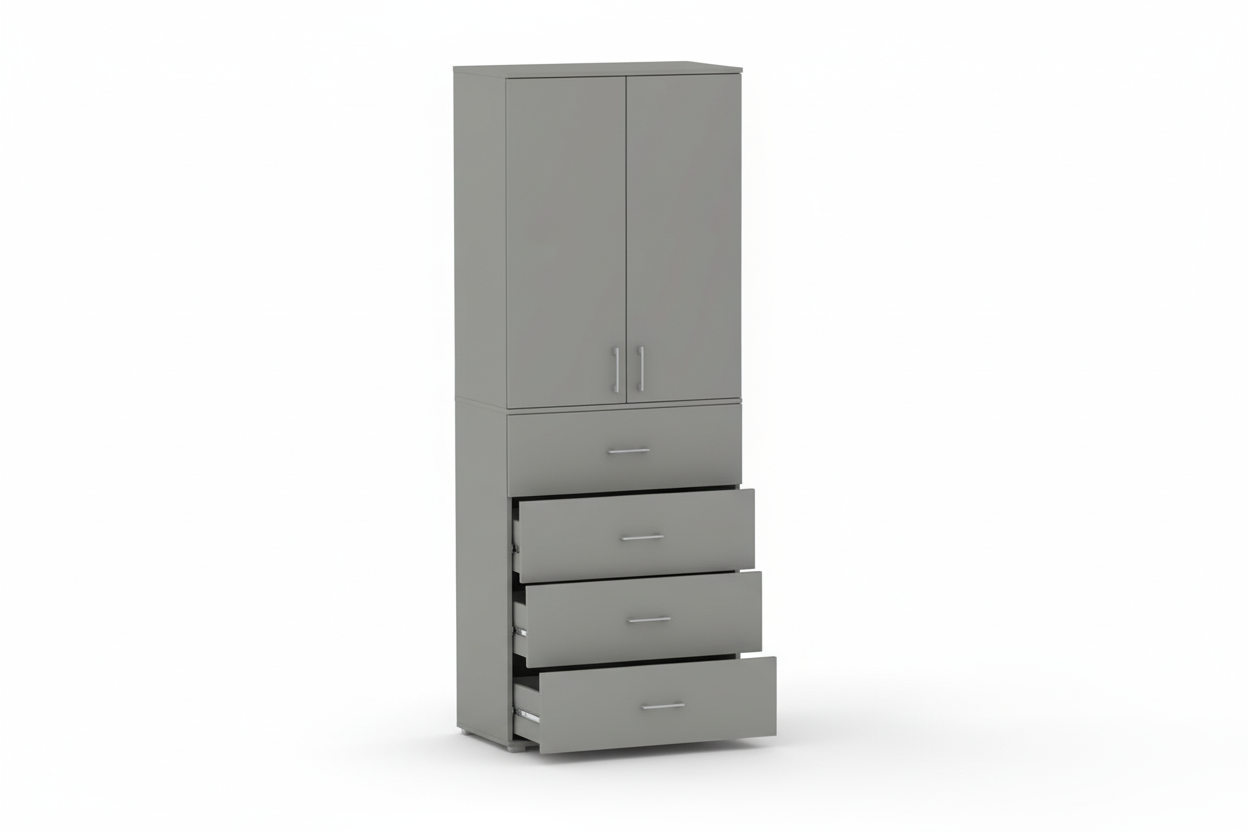 Sercem tego regału są cztery pojemne szuflady, zaprojektowane z myślą o maksymalnym komforcie użytkowania. Wyposażone w prowadnice kulkowe z pełnym wysuwem, gwarantują płynne i ciche otwieranie oraz zamykanie, a także pełny dostęp do zawartości. Wysoki front szuflady (aż 25,5 cm) oraz przemyślane wymiary wewnętrzne pozwalają na przechowywanie różnorodnych przedmiotów, od ubrań po dokumenty, utrzymując ład i porządek. Górna część regału została wyposażona w praktyczne drzwi, które zapewniają dyskretne przechowywanie. W wersjach o szerokości 40 i 50 cm znajdą Państwo drzwi pojedyncze, idealnie komponujące się z całością bryły.